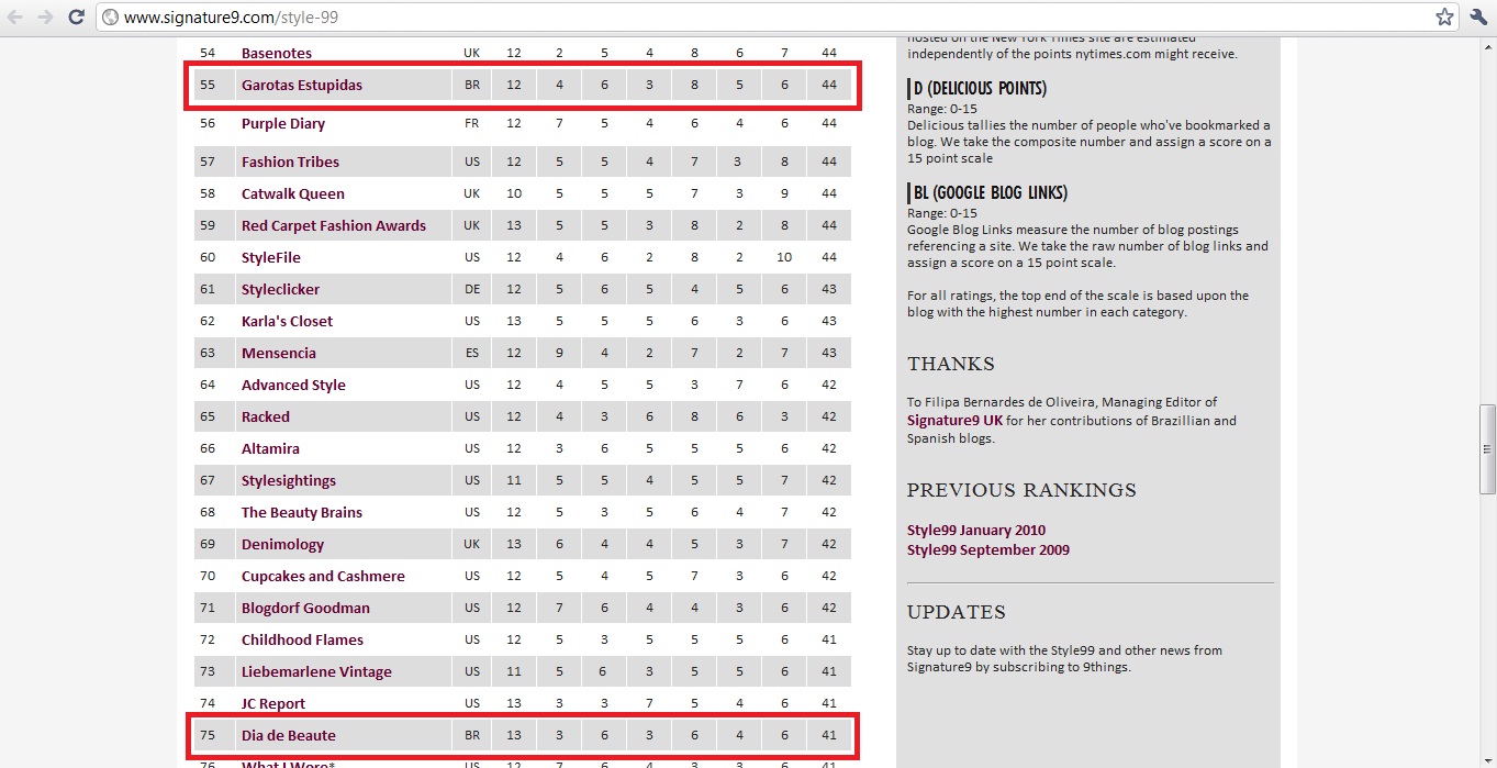Não é por acaso que numa lista dos blogs de moda mais influentes do mundo, divulgada pelo site americano “Signature 9”, em abril de 2010, constam dois representantes brasileiros. Os critérios usados para que se chegasse a esse resultado foi a soma de quesitos como frequência, qualidade das postagens, popularidade na rede e, também, fama. Vale lembrar que os representantes do Brasil não estão na posição de lanterninhas, não.
